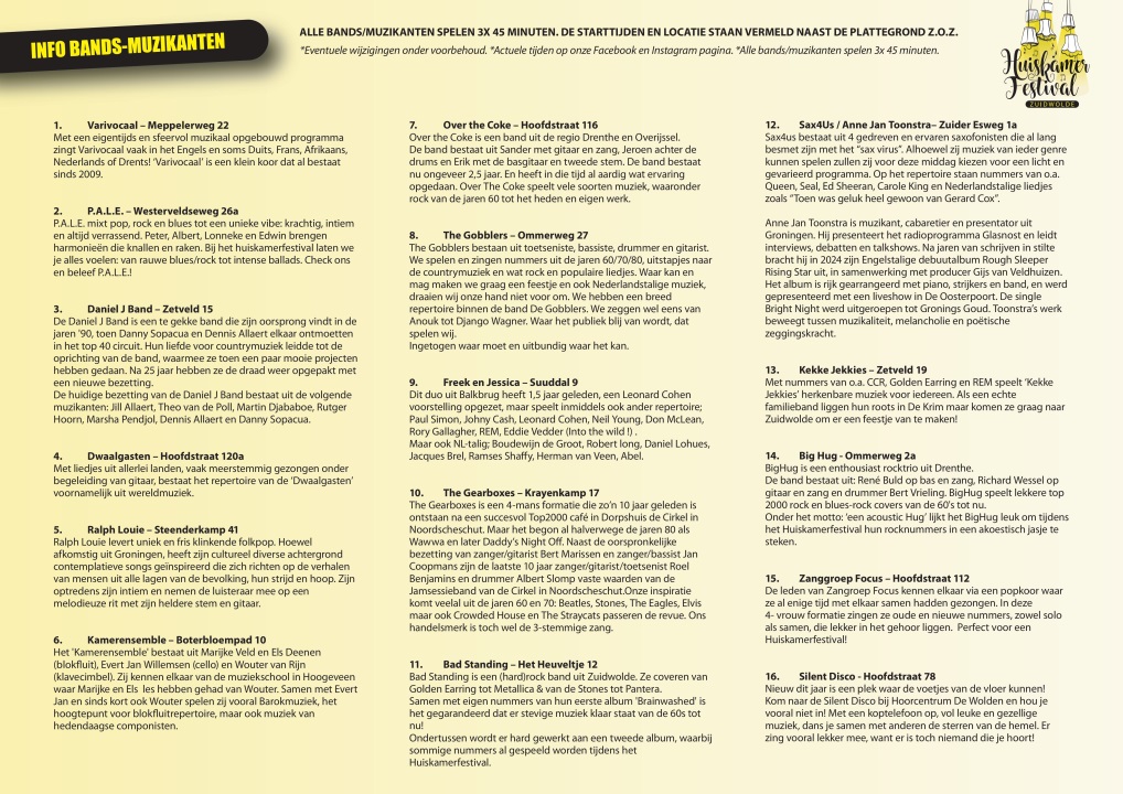 Hieronder vind je de plattegrond met alle optredende bands en muzikanten tijdens de 6e editie van het Huiskamerfestival Zuidwolde.
