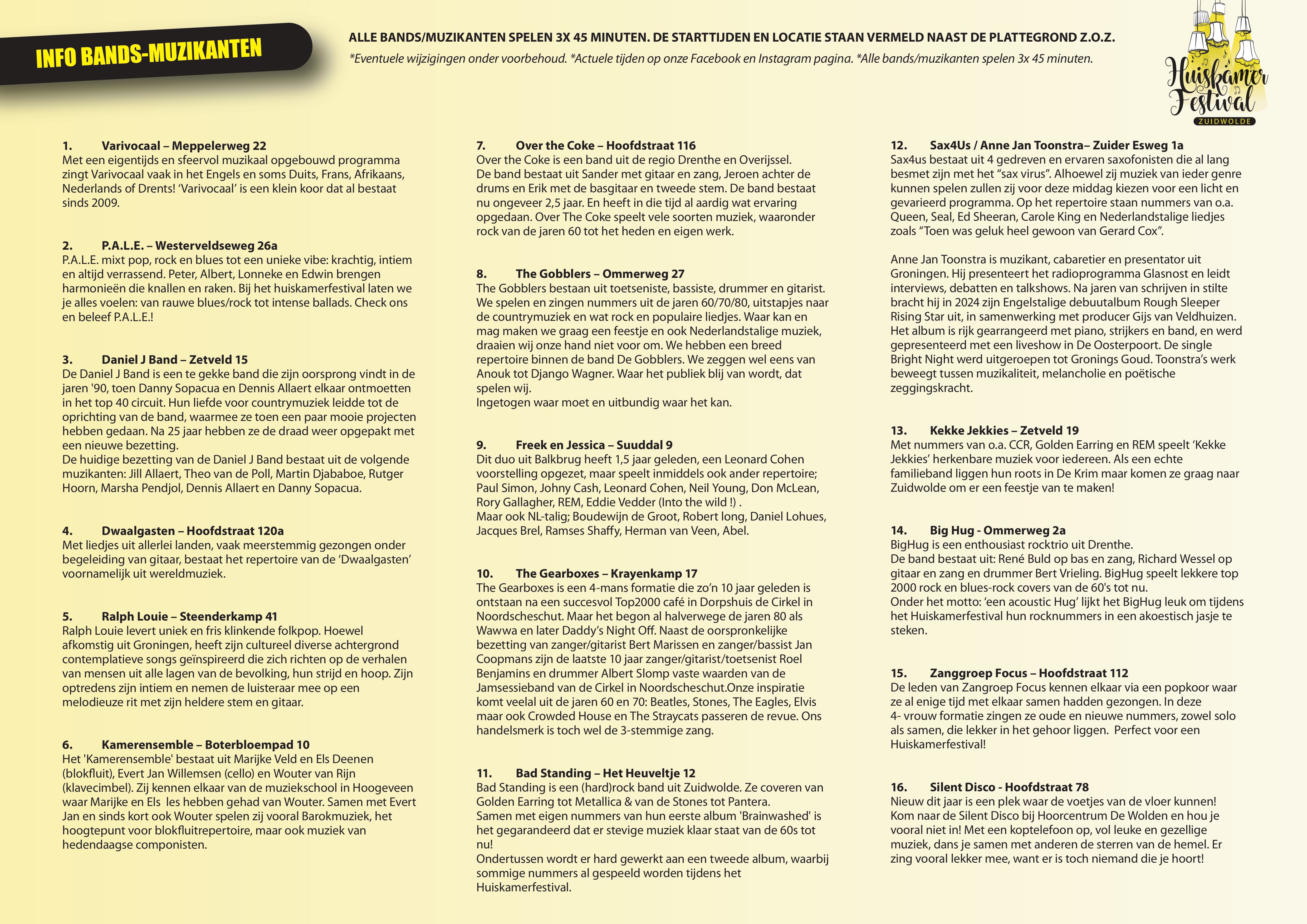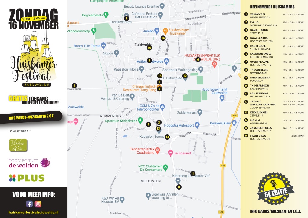 Hieronder vind je de plattegrond met alle optredende bands en muzikanten tijdens de 6e editie van het Huiskamerfestival Zuidwolde.